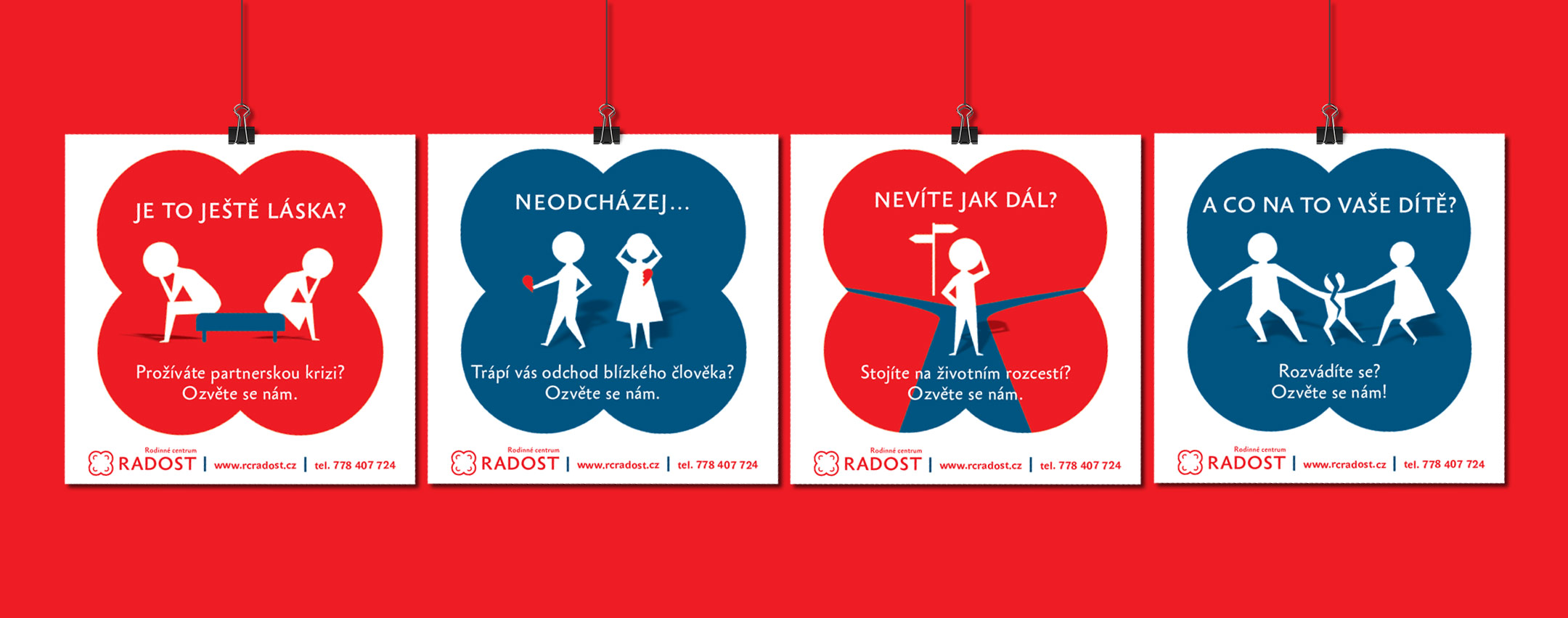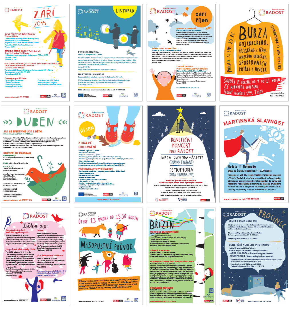 Logo, které jsme vytvořili pro RC Radost, se stalo základem všech propagačních a informačních materiálů tohoto našeho zákazníka. Kromě různých letáků a cedulí jsme pro rodinné centrum vytvořili soubor plakátů s našimi autorskými ilustracemi. Navrhli jsme také sadu informačních piktogramů, které jsme zároveň otextovali našimi slogany. V neposlední řadě jsme budovu RC Radost vybavili orientačním systémem.